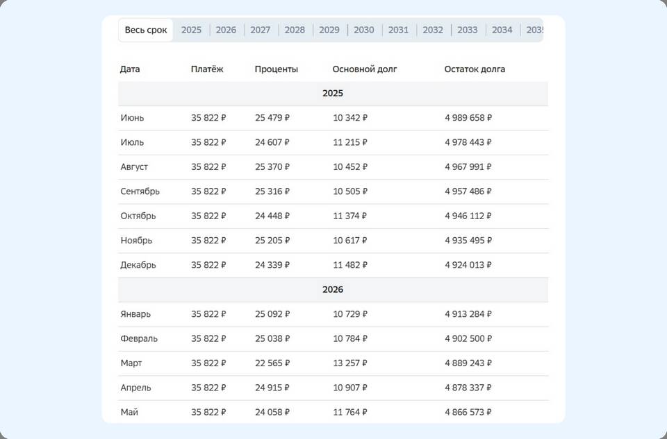 - Учитывать схему начисления процентов (аннуитетная/дифференцированная)