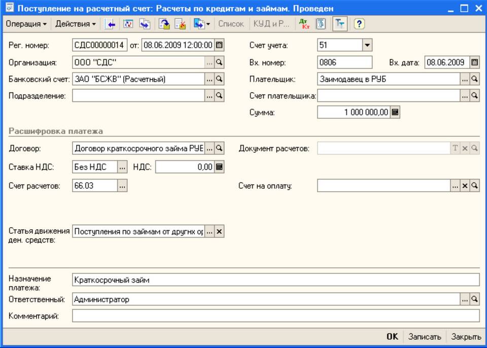 - Создаем документ "Списание с расчетного счета" (для заемщика)